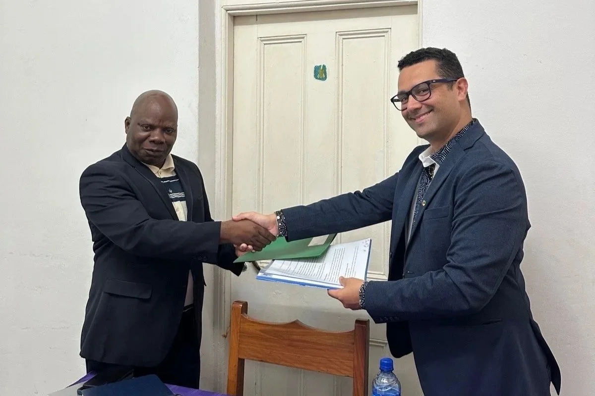 Dr. Luiz shaking hands with Mozambique Presbyterian Church official.